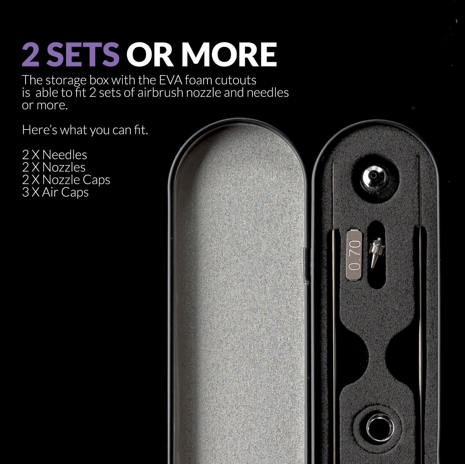 Holds 2 Sets or More: With its versatile EVA foam cutouts, this box can accommodate up to two sets of airbrush nozzles, needles, and more.